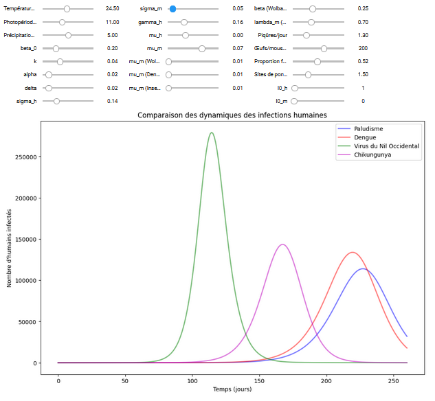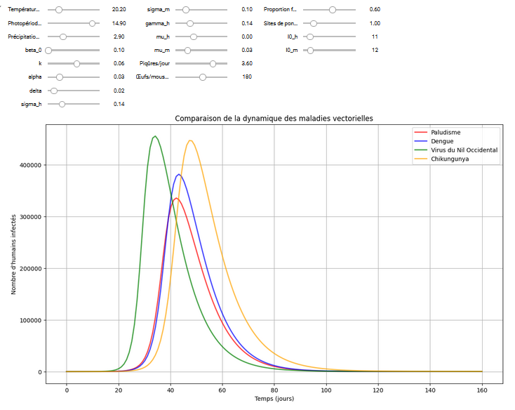 - Visualisation : Les courbes des humains infectés, par exemple, pour chaque maladie (paludisme, dengue, virus du Nil occidental, et Chikungunya) seront tracées sur un même graphique, vous permettant de comparer l'épidémiologie de ces maladies vectorielles en fonction des paramètres ajustés.