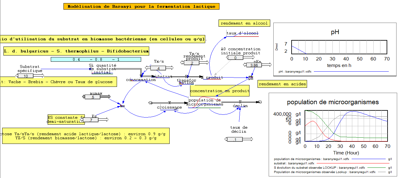Le modèle est construit avec le logiciel Vensim. Les simulations sont comparées aux données expérimentales ou industrielles. Ce modèle permet aussi de travailler avec les fabrications du Kéfir ou du Kombutcha.