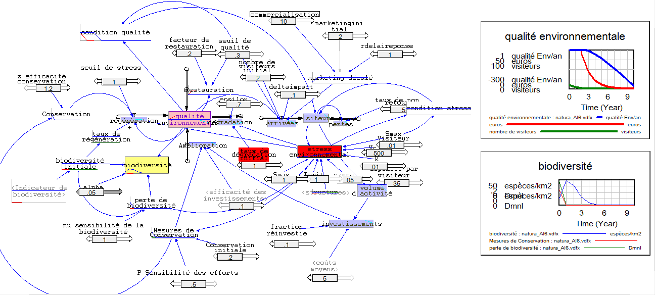 L'analyse de ce type de diagramme permet de visualiser les relations entre ces différents facteurs et leur influence sur la biodiversité et la résilience des écosystèmes. Ce modèle en Vensim permet de comprendre l’impact des interactions entre les structures, le marketing, les visiteurs et le stress environnemental, tout en prenant en compte l'effet stabilisateur des mesures de conservation. Le modèle peut être ajusté et détaillé en fonction de données spécifiques sur les flux de visiteurs, la nature des infrastructures, ou les effets directs sur les habitats pour une simulation plus précise.